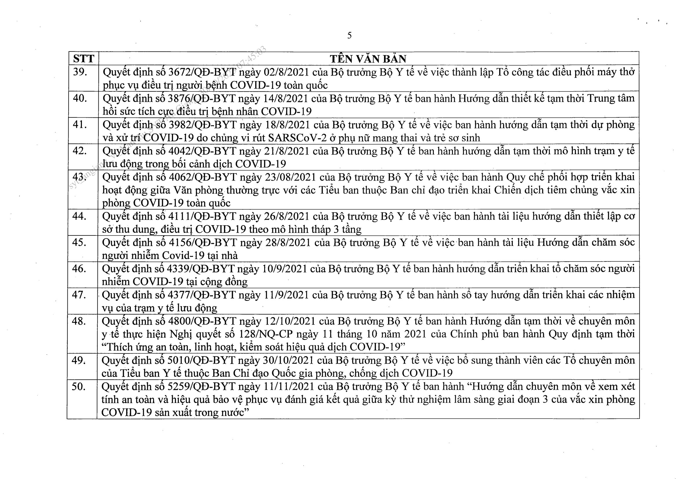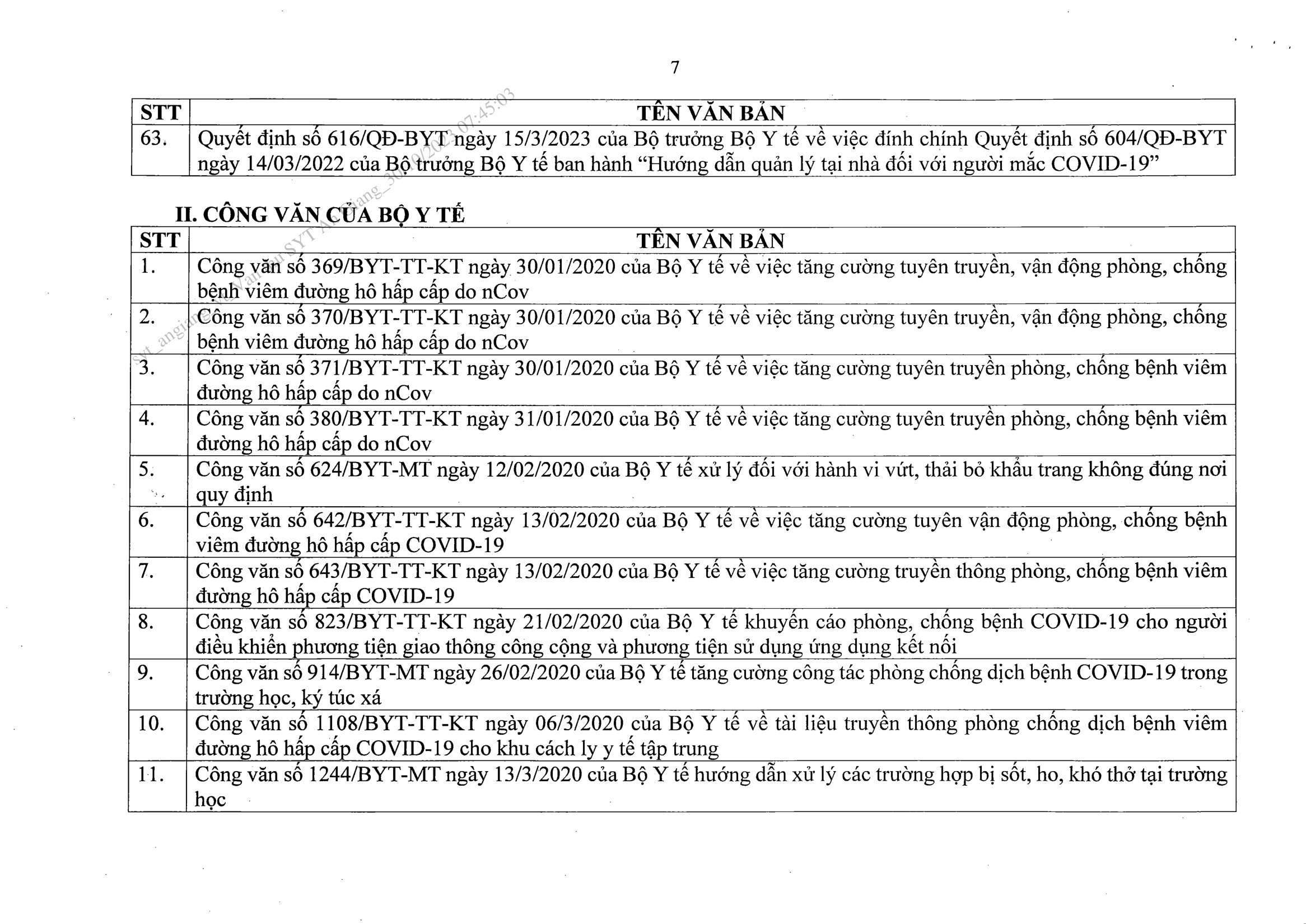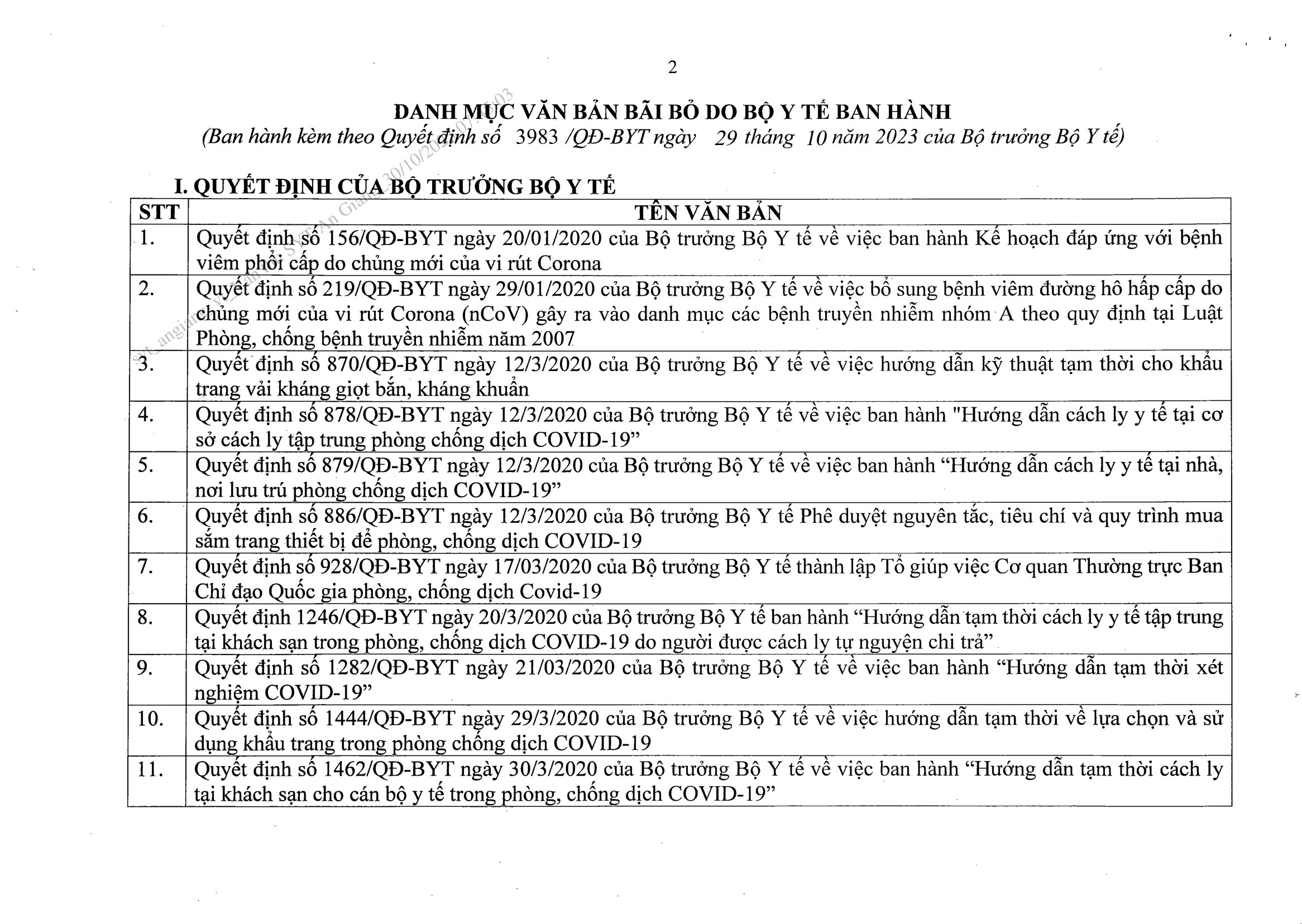 Tại quyết định số 3983/QĐ-BYT do Thứ trưởng Bộ Y tế Nguyễn Thị Liên Hương lý ban hành, Bộ Y tế bãi bỏ một số văn bản phòng, chống dịch COVID-19 do Bộ Y tế ban hành, cụ thể gồm: 63 quyết định, 92 công văn và 5 công điện. Quyết định của Bộ Y tế có hiệu lực từ ngày 29/10/2023.